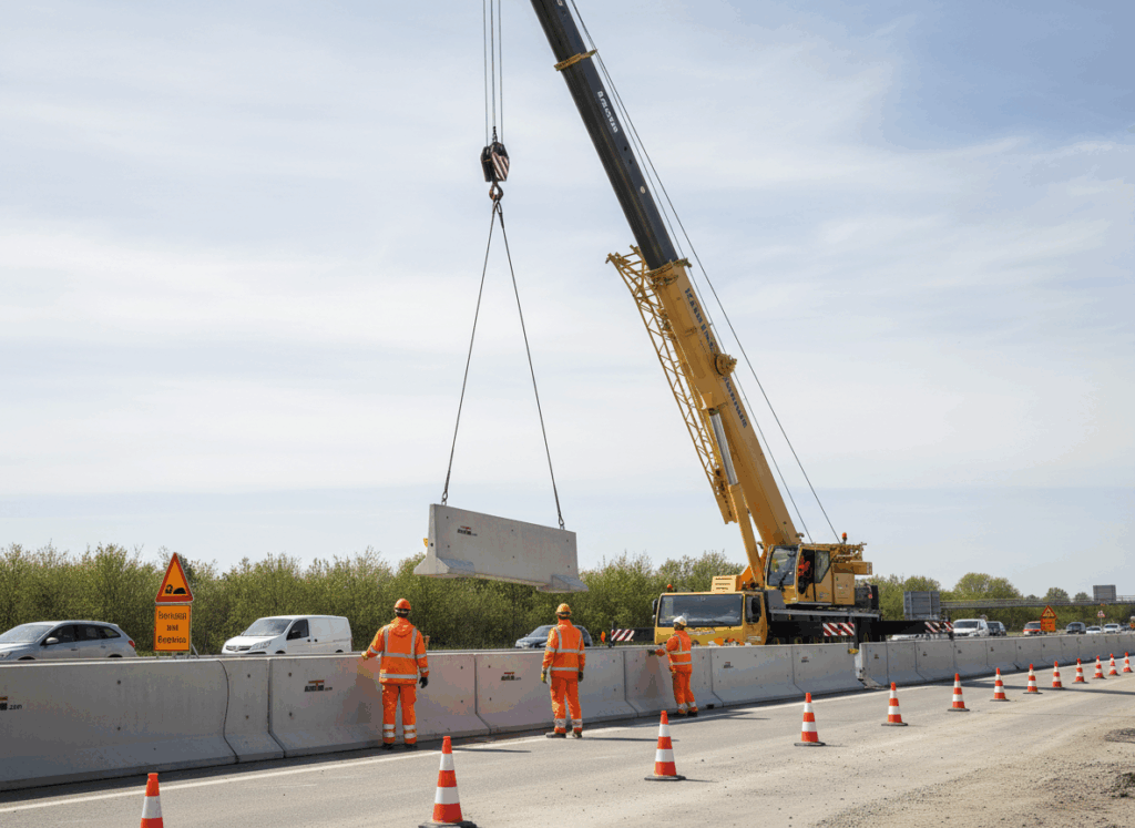 Les modules Klostab s’assemblent facilement pour former une glissière en béton pour les autoroutes ou urbaine continue. La pose par grutage assure une mise en place rapide, y compris lors d’interventions nocturnes ou urgentes. Cette modularité permet d’adapter rapidement le tracé en fonction du phasage des travaux.